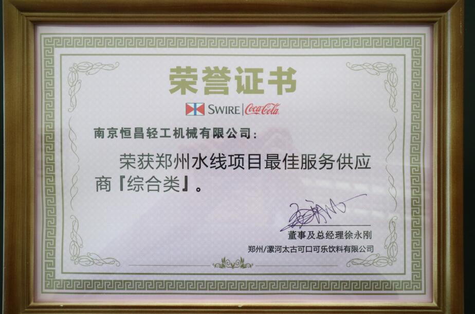 南京恒昌包裝作為后段整包商,在鄭州太古可口可樂48000bph水線項(xiàng)目中獲得“最佳服務(wù)供應(yīng)商”殊榮!